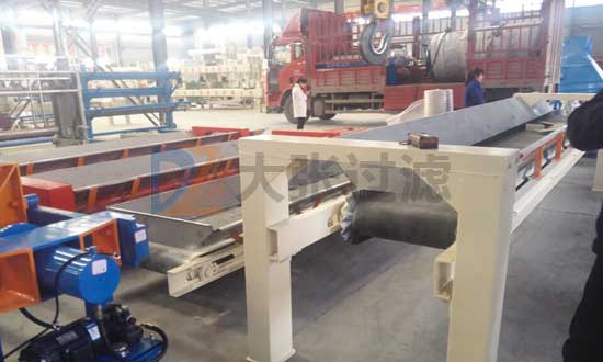 水平輸送機至于壓濾機底部,采用可承重橫梁,增加導泥裝罝,重型支腿,可以把壓濾機直接放置在輸送機上。